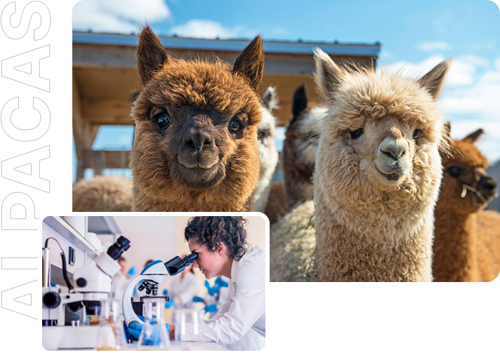 Although less common than Huacayas, Suris, are prized for their luxurious fiber and are selectively bred for this trait.They tend to be rarer and slightly more challenging to handle, requiring specialized care in research environments. While both breeds have traditionally been valued for their high-quality fleece, their unique immune system characteristics have garnered attention in clinical and biomedical research, particularly due to their ability to produce heavy-chain antibodies, or “nanobodies” (Fig.1).